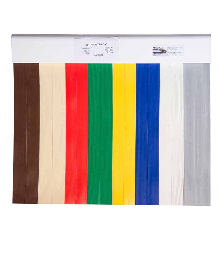 Plastic strap curtain in eight colors (brown, cream, red, green, yellow, blue, white and grey).