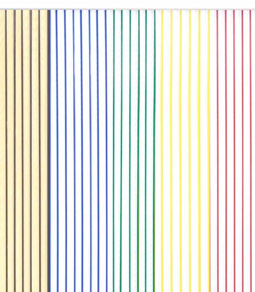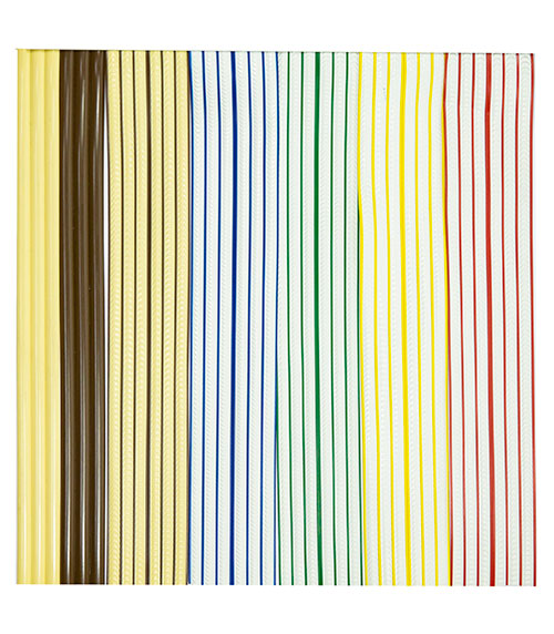 Fluted bicolored plastic strap curtain in five available models (brown-beige, yellow-white, blue-white, red-white and green-white).