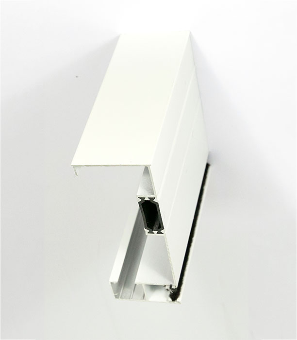 The white lacquered extruded aluminum guide is necessary when you want to replace PVC slats with aluminum ones. The guide includes a brush seal and is inserted into the galvanized guide installed on-site. Model with a drawer for the sweeper and a length of 160 cm with thermal break for insulation
